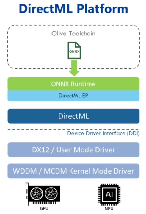 微軟表示,在 DirectML 支持 NPU 后,開(kāi)發(fā)者可以通過(guò)跨平臺推理引擎“ONNX Runtime”等 API,使用芯片內置的 NPU 運行 AI 模型,從而改善模型運行效能。