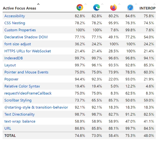 Interop 2024 還將改進(jìn)可訪(fǎng)問(wèn)性、自定義屬性、字體大小、指針事件、滾動(dòng)條樣式、文本方向等,感興趣的小伙伴可以訪(fǎng)問(wèn) Interop 2024 測試網(wǎng)站,查看每個(gè)瀏覽器的兼容性得分。