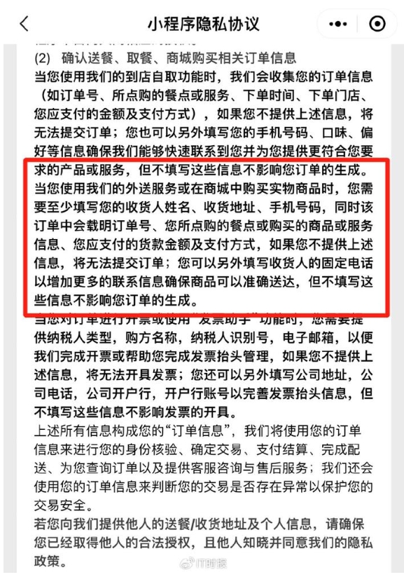 關(guān)于外送服務(wù),隱私協(xié)議中表示,需要至少填寫(xiě)收貨人姓名、收貨地址、手機號碼。對于位置信息,協(xié)議中強調,“我們會(huì )收集您的位置信息來(lái)判斷您所處的位置,以自動(dòng)展示您所在區域可以享受的服務(wù),但不會(huì )判斷您的行蹤軌跡。如果關(guān)閉位置權限,您可能無(wú)法使用基于位置信息為您提供的服務(wù),或者無(wú)法達到相關(guān)服務(wù)的預期效果。”但不填寫(xiě)這些信息,并不影響訂單的生成。
