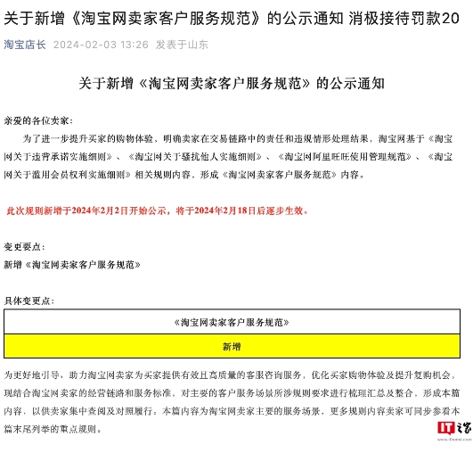 而在 2 月 5 日,媒體東方財經(jīng)詢(xún)問(wèn)了淘寶商家客服,對方表示,目前相關(guān)規定還在意見(jiàn)征集階段,屆時(shí)將“進(jìn)一步根據賣(mài)家意見(jiàn)調整規則”、“如果出新規定一般會(huì )提前進(jìn)行公示”。
