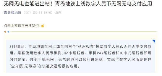 青島地鐵上線(xiàn)數字人民幣無(wú)網(wǎng)無(wú)電支付應用:手機無(wú)網(wǎng)無(wú)電也可進(jìn)出站