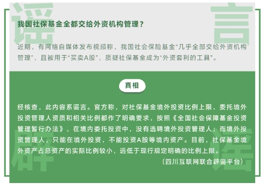 針對“我國社?;鹑冀唤o外資機構管理”,四川互聯(lián)網(wǎng)聯(lián)合辟謠平臺回應:官方稱(chēng),對社?;鹁惩馔顿Y比例上限、委托境外投資管理人資質(zhì)和相關(guān)比例都作了明確要求,按照《全國社會(huì )保障基金投資管理暫行辦法》,在境內委托投資中,沒(méi)有選聘境外投資管理人;而境外投資管理人,只能在境外投資,不能投資 A 股等境內資產(chǎn)。目前,社?;鹁惩赓Y產(chǎn)占總資產(chǎn)的實(shí)際比例較小,遠低于現行規定明確的比例上限。