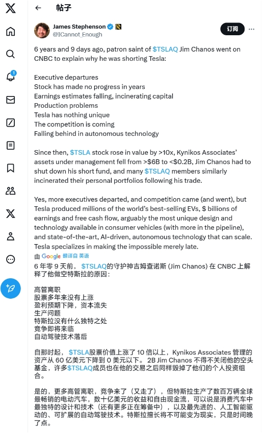 馬斯克回應的這則推文,提到了 6 年前大空頭查諾斯做空特斯拉的原因,包括行政人員離職、股票多年無(wú)進(jìn)展、盈利預期下降以及產(chǎn)量問(wèn)題、缺少獨特之處等方面。